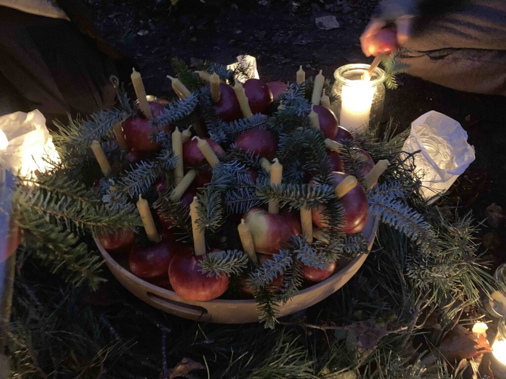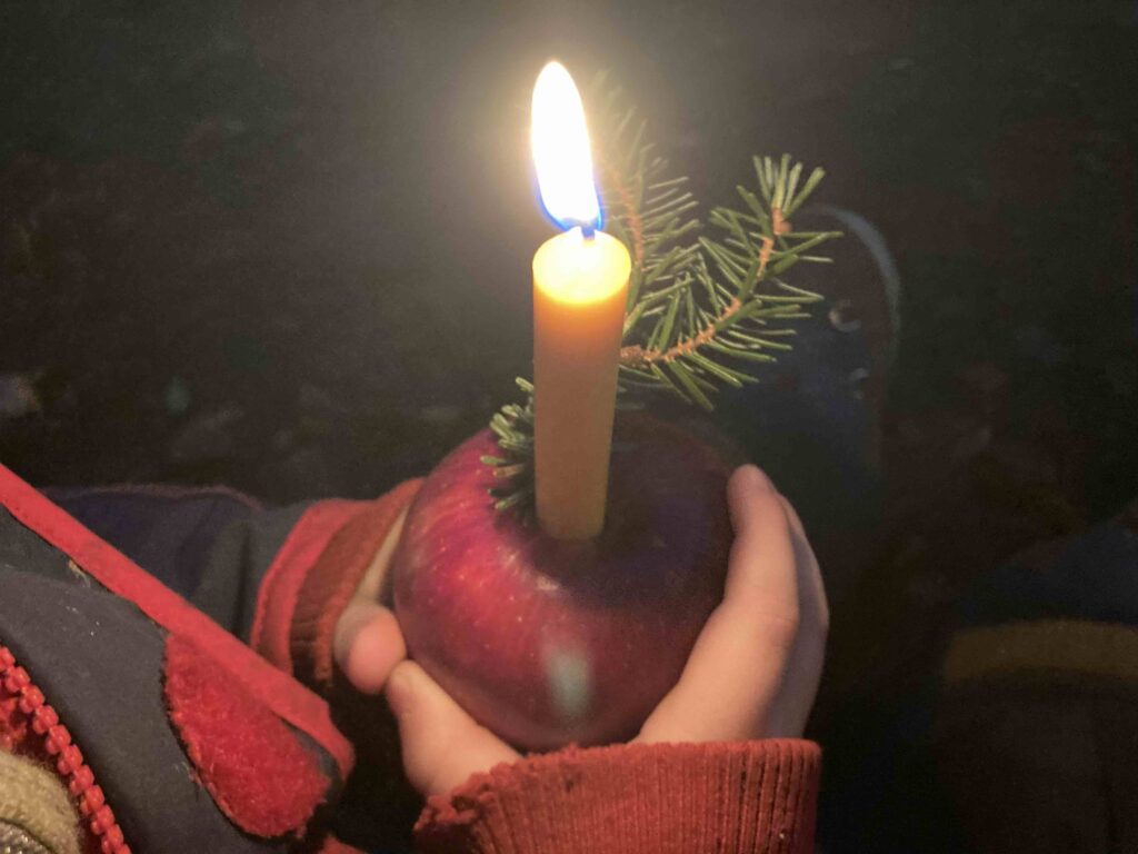 Und zum Abschluss haben wir uns im Wald versammelt. Bei stimmungsvollem Kerzenschein erhielt jedes Kind ein Apfellicht, während die Familien sangen: