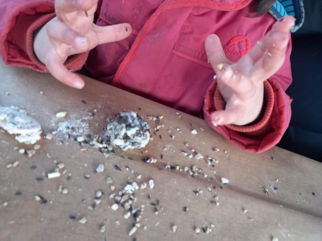 An einem anderen Adventstag haben die Kinder Vogelfutter-Zapfen gefüllt. Das war eine schöne Matscherei!