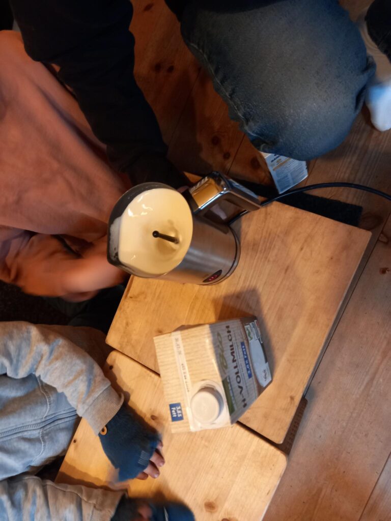 Dann gab es Kinderkaffee mit Milchschaum (danke an die Familie, die uns den Schäumer ausgeliehen hat!) und Nussecken.